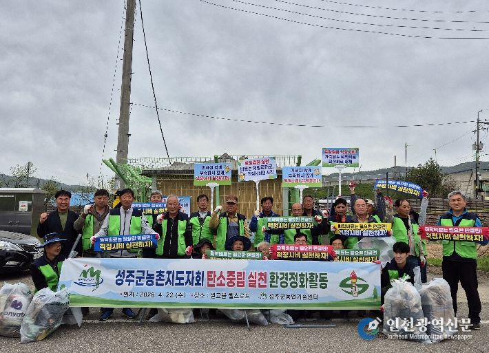 [인천광역신문] 최예준 기자 | 성주군은 4월 22일 성주읍 대황리 헬스로드(대흥교) 일원에서 농촌지도자 회원 20여 명이 참여한 가운데 탄소중립 실천을 위한 환경정화 활동을 실시했다고 밝혔다.