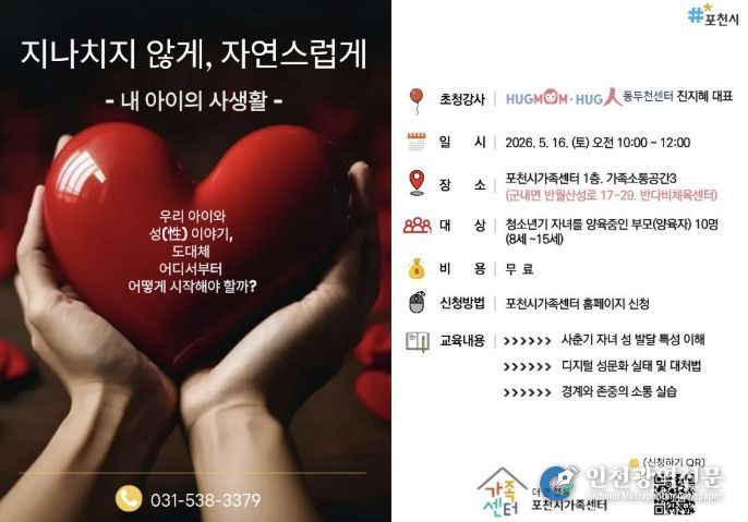 [인천광역신문] 최예준 기자 | 포천시 직영 더 큰 행복 포천시가족센터는 오는 21일부터 사춘기 자녀를 둔 양육자를 대상으로 부모 교육 프로그램 ‘지나치지 않게, 자연스럽게’의 참여자를 모집한다. 이번 교육은 5월 16일 오전, 포천시가족센터 가족소통공간(반다비체육센터 1층)에서 대면 강의로 진행된다.