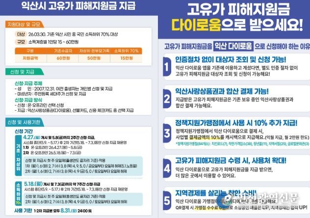 정헌율 익산시장은 "고유가 피해지원금은 중동전쟁발 고유가, 고환율, 고물가로 인한 시민 부담을 덜고 취약계층을 보다 두텁게 지원하기 위한 정책"이라며 "시민 여러분께서는 익산 다이로움으로 피해지원금을 수령해 더 많은 혜택을 누리시길 바란다"고 말했다.
