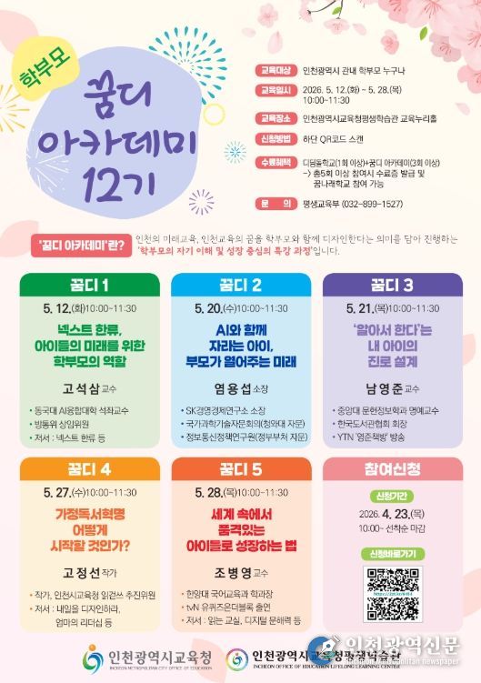 [인천광역신문] 최예준 기자 | 인천광역시교육청평생학습관은 23일부터 인천 관내 학부모를 대상으로 ‘2026년 학부모 꿈디 아카데미 12기’ 학습자를 모집한다.