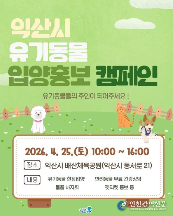 익산시는 오는 25일 배산체육공원에서 '2026년 상반기 유기동물 입양·홍보 캠페인'을 개최한다고 23일 밝혔다.