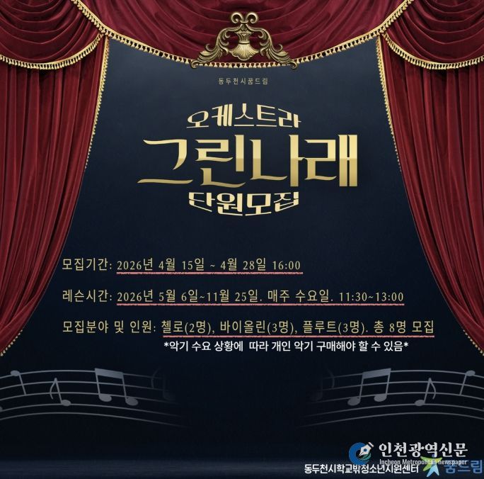 [인천광역신문] 최예준 기자 | 동두천시학교밖청소년지원센터는 2026년을 맞아 학교 밖 청소년을 대상으로 ‘그린나래 오케스트라’ 신규 단원을 모집한다고 밝혔다.