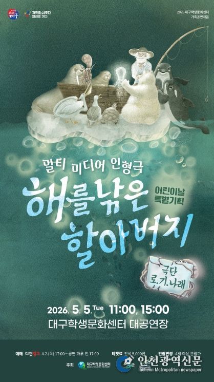[인천광역신문] 최예준 기자 | 대구학생문화센터는 어린이날을 맞아 어린이와 가족 관객을 위한 특별 기획공연 '멀티미디어 인형극 해를 낚은 할아버지'를 오는 5월 5일 대공연장에서 선보인다.