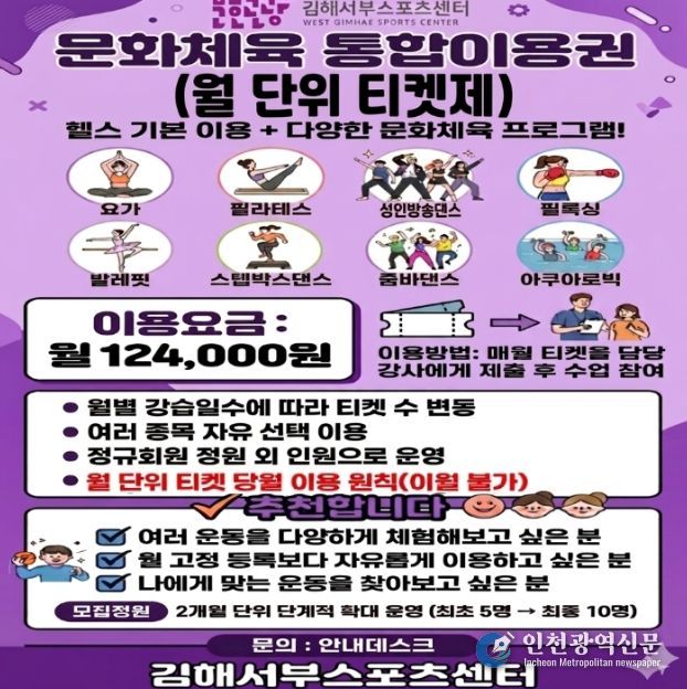 [인천광역신문] 최예준 기자 | (재)김해문화관광재단 김해서부스포츠센터는 이용자 중심의 유연한 운동환경 조성과 문화체육 프로그램 활성화를 위해 김해시 공공체육시설 최초로 ‘문화체육 티켓제 통합이용권’ 도입을 추진한다고 밝혔다.