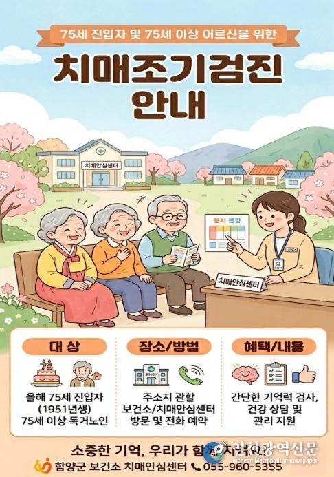 함양군 관계자는 “치매는 조기에 발견할수록 관리가 쉬워지고 삶의 질을 오래 지킬 수 있다”라며 “대상자들이 정기적인 검진에 참여해 건강한 노후를 준비할 수 있도록 적극 안내해 나가겠다”라고 말했다.