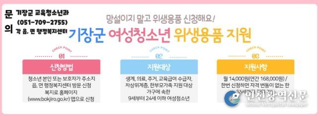 [인천광역신문] 최예준 기자 | 기장군은 ‘2026년 여성청소년 위생용품 지원사업’을 본격 추진한다고 23일 밝혔다.