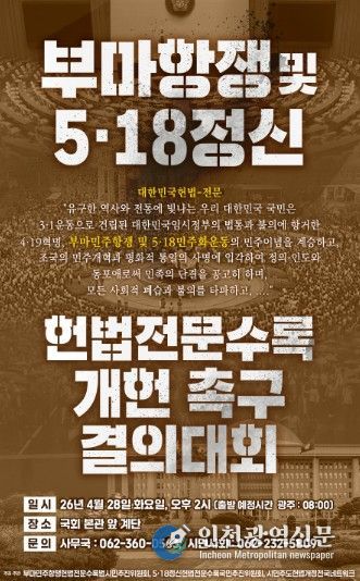 [인천광역신문] 최예준 기자 | 광주광역시는 오는 28일 오후 2시 국회 본관 앞에서 개헌안 가결을 위한 정치권의 결단을 촉구하는 ‘부마항쟁 및 5·18정신 헌법 전문 수록 개헌 촉구 국민결의대회’가 열린다고 밝혔다.