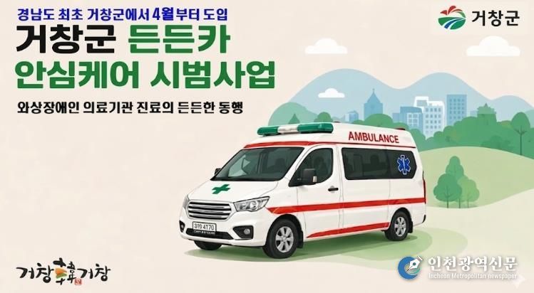 [인천광역신문] 최예준 기자 | 거창군은 경상남도 교통정책과 공모를 통해 지난 3월 11일에 선정된 ‘2026년 든든카(Car) 안심케어(Care) 시범사업’을 지역 내 교통약자 와상장애인의 의료기관 이동편의 개선을 위해 4월 24일부터 경상남도에서 최초로 도입한다고 밝혔다.