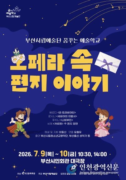 [인천광역신문] 최예준 기자 | 부산시립예술단에서는 특별기획 ‘오페라 속 편지 이야기’에 출연할 솔리스트들을 모집한다. 이번 오페라 무대를 통해 자신만의 실력과 끼를 방출할 부산지역의 청년 예술인들을 선발할 예정이다.