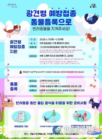 [인천광역신문] 최예준 기자 | 광진구는 반려동물의 건강 증진과 구민의 안전을 위해 ‘2026년 봄철 광견병 예방접종’ 지원을 4월 30일까지 시행한다.