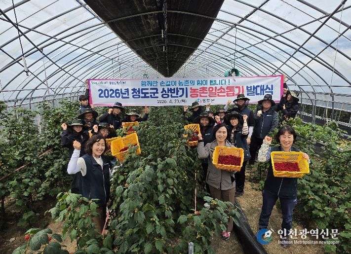 [인천광역신문] 최예준 기자 | 청도군은 농촌인구 감소와 고령화로 일손 부족을 겪고 있는 농가를 지원하기 위해 4월 23일 운문면 방지리 산딸기 농장에서 발대식을 개최하고, 농가의 산딸기 전정 및 수확 작업을 도우며 2026년 상반기 농촌일손돕기의 힘찬 시작을 알렸다.
