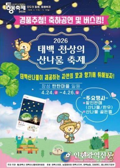 [인천광역신문] 최예준 기자 | 태백시는 오는 24일 오후 6시부터 장성탄탄마당(장성중앙시장 일원) 중앙무대에서‘2026 태백 천상의 산나물 축제’ 개막행사를 진행한다고 밝혔다.