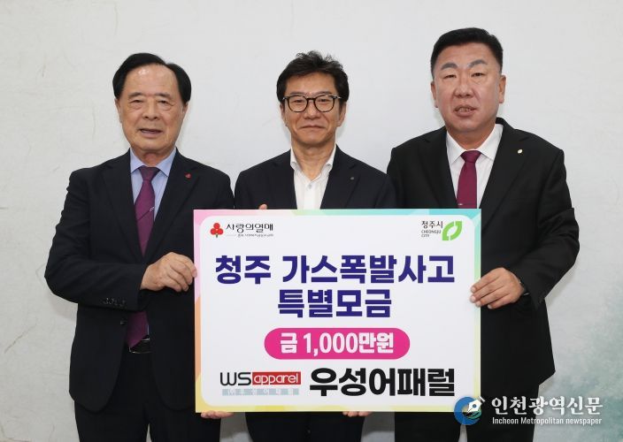 23일 ㈜우성어패럴은 청주시청을 방문해 봉명동 상가 가스폭발 사고로 피해를 입은 주민들을 돕기 위해 성금 1,000만원을 충북사회복지공동모금회를 통해 기탁했다.