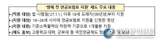 아울러 첫 보험료 지원으로 국민연금 가입자가 된 후에는 두루누리 보험료 지원, 저소득 지역가입자 보험료 지원, 실업크레딧 등 다양한 지원 제도의 혜택을 받을 수 있다.