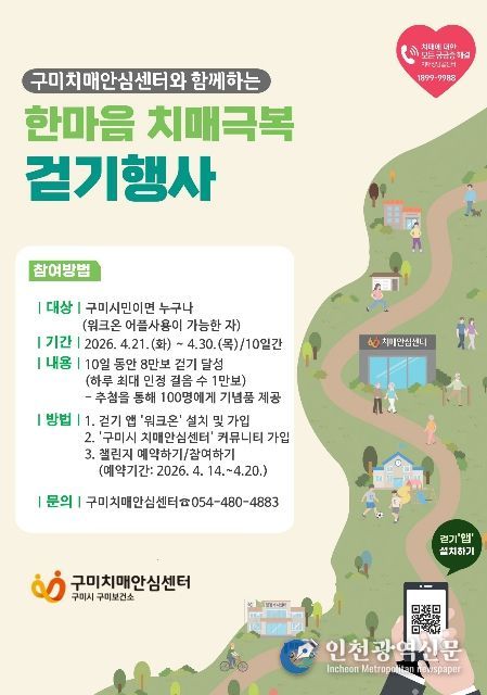 [인천광역신문] 최예준 기자 | 구미시는 치매 예방과 시민 건강 증진을 위해‘2026년 한마음 치매극복 걷기 챌린지’를 운영한다. 이번 챌린지는 시민 누구나 참여할 수 있는 비대면 걷기 프로그램으로 진행된다.