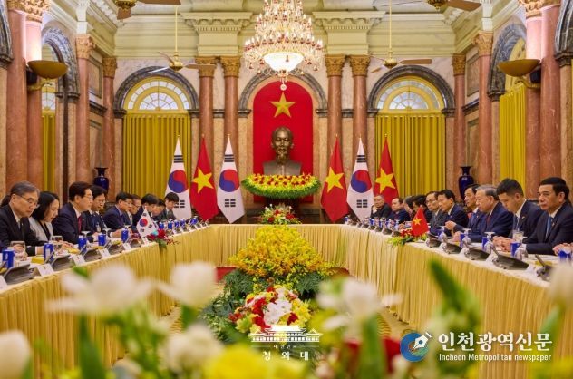 [인천광역신문] 최예준 기자 | 베트남을 국빈 방문 중인 이재명 대통령은 22일(현지시간) 오후 베트남 국가주석궁에서 또 럼 당서기장 겸 국가주석과 정상회담을 갖고, 양국 간 포괄적 전략 동반자 관계 발전 방안과 지역·국제 정세 등에 대해 심도 있게 논의했다고 이규연 청와대 홍보소통수석이 서면 브리핑했다.
