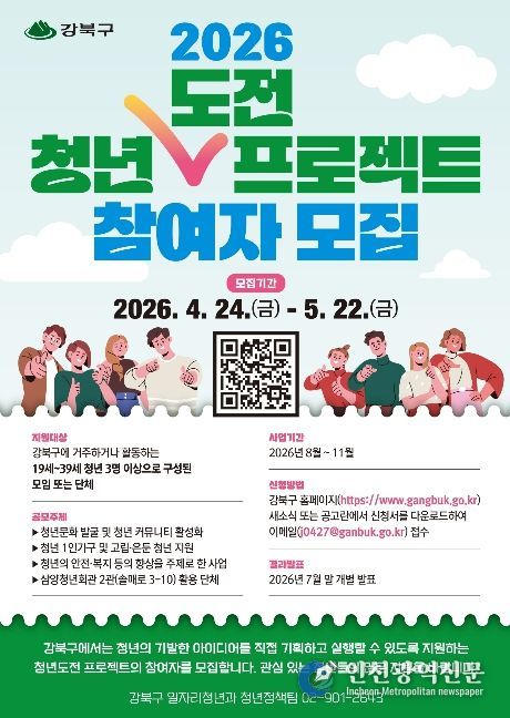 [인천광역신문] 최예준 기자 | 서울 강북구는 청년들의 창의적인 아이디어를 지역사회에서 실현할 수 있도록 돕는 ‘2026년 청년도전 프로젝트’ 참여자를 모집한다고 밝혔다.