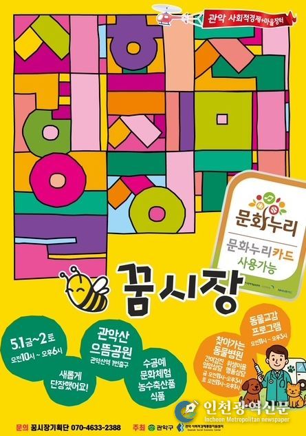 [인천광역신문] 최예준 기자 | 관악구가 오는 5월 1일과 2일 양일간 관악산 으뜸공원에서 사회적경제장터 ‘꿈시장’과 ‘찾아가는 동물병원’을 함께 개최해 봄나들이객을 반기는 풍성한 콘텐츠를 선보인다.
