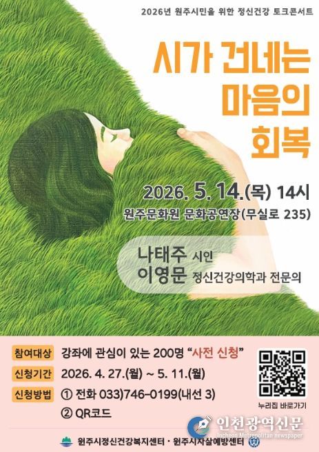 [인천광역신문] 최예준 기자 | 원주시정신건강복지센터는 다음 달 14일 원주문화원 문화공연장에서 ‘시가 건네는 마음의 회복’을 주제로 정신건강 토크콘서트를 개최한다.