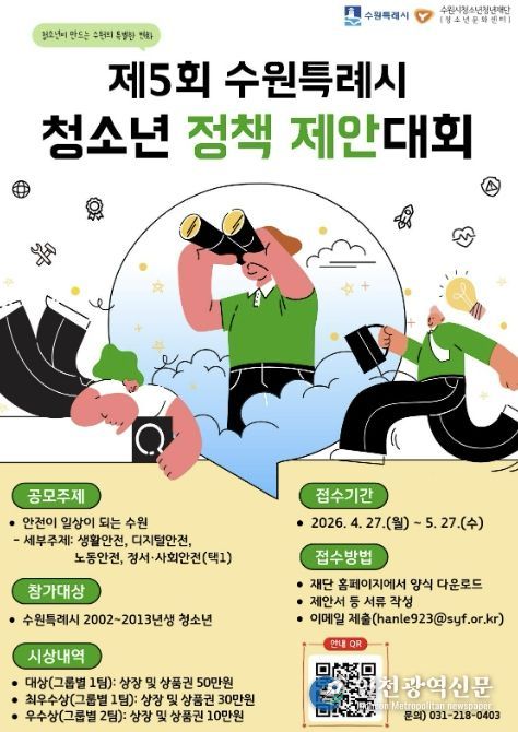 [인천광역신문] 최예준 기자 | 수원시청소년청년재단 수원청소년문화센터는 청소년이 정책을 기획하고 제안하는 ‘제5회 수원특례시 청소년 정책 제안대회’ 참가팀을 4월 27일부터 5월 27일까지 모집한다.