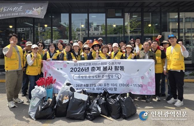 [인천광역신문] 최예준 기자 | 전국고용서비스협회 수원지부 회원들이 23일 수원천 일대에서 춘계 환경정화 봉사활동을 했다.