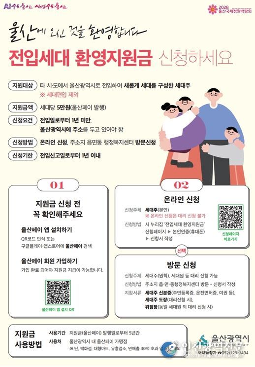 전입세대 환영 지원금은 울산에 새롭게 세대를 구성한 전입세대를 환영하고 울산에 조기 정착을 지원하기 위해 세대당 5만 원을 울산페이로 지원하는 사업이다.