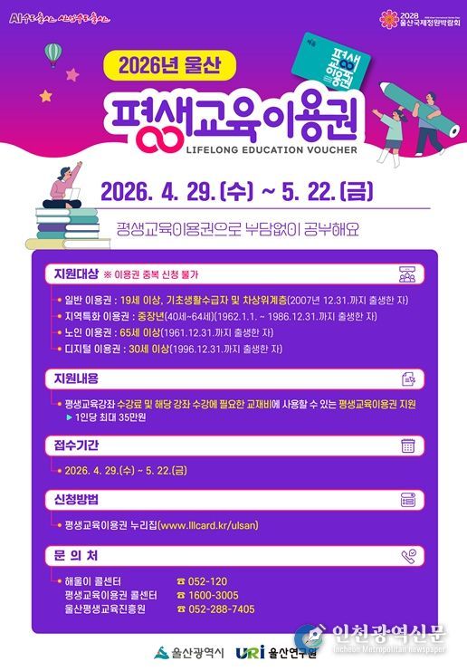 [인천광역신문] 최예준 기자 | 울산시가 경제적 여건에 따른 교육격차를 완화하고, 성인의 자아실현을 지원하기 위해 ‘2026년 평생교육이용권 지원사업’의 2차 신청 접수에 나선다.