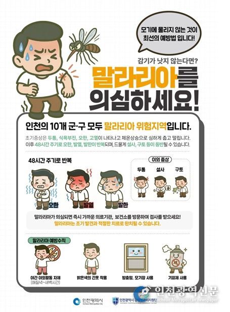 [인천광역신문] 최예준 기자 | 인천광역시는 오는 4월 25일 ‘세계 말라리아의 날’을 맞아 본격적인 모기 활동 시기에 대비해 시민들에게 국내 말라리아 감염 예방과 조기 검사의 중요성을 당부했다.
