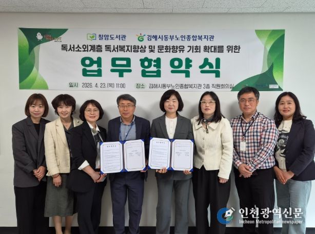 [인천광역신문] 최예준 기자 | 김해시 칠암도서관은 독서소외계층의 독서복지 향상과 문화 향유 기회 확대를 위해 김해시동부노인종합복지관과 업무협약을 체결했다고 24일 밝혔다.