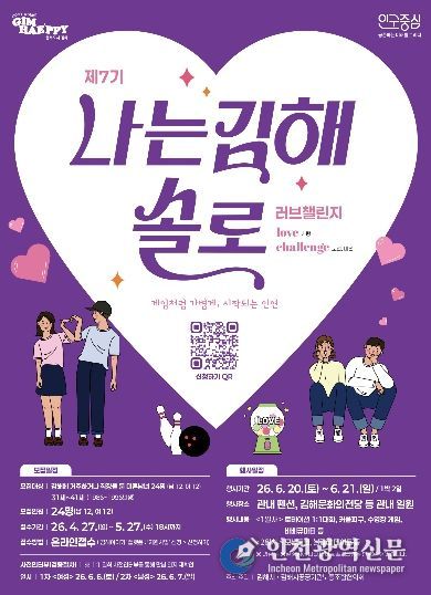 [인천광역신문] 최예준 기자 | 김해시는 오는 6월 20일부터 21일까지 1박 2일 일정으로 관내 펜션과 김해문화의전당 등에서 진행하는‘제7기 나는 김해솔로-러브챌린지’참가자 24명(남·여 각 12명)을 모집한다고 24일 밝혔다.