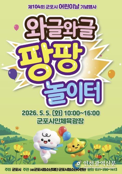 [인천광역신문] 최예준 기자 | 군포시는 제104회 어린이날을 맞아 오는 5월 5일 오전 10시부터 오후 4시까지 군포시민체육광장에서 ‘와글와글 팡팡 놀이터’를 주제로 어린이날 기념행사를 개최한다.
