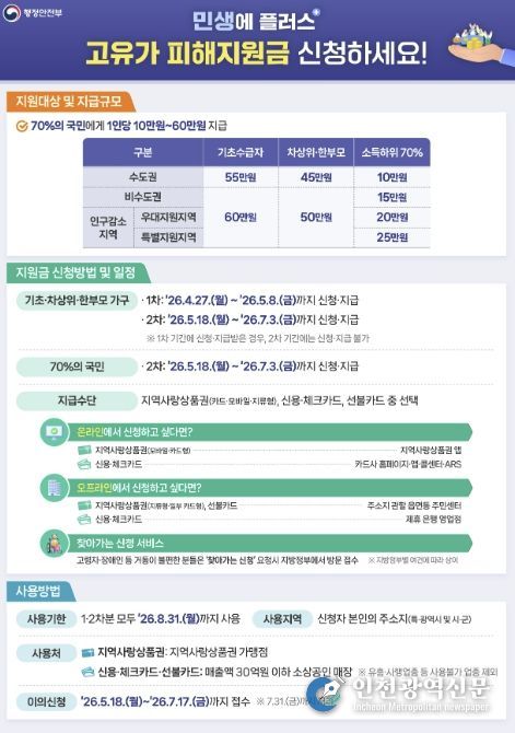 민생안정지원금 2차는 4월 27일부터 5월 22일까지, 고유가 피해지원금 1차는 4월 27일부터 5월 8일까지 각각 신청·접수할 예정이며, 군은 군민들이 신청 기간을 놓치지 않도록 지속적인 홍보와 안내를 이어갈 계획이다.