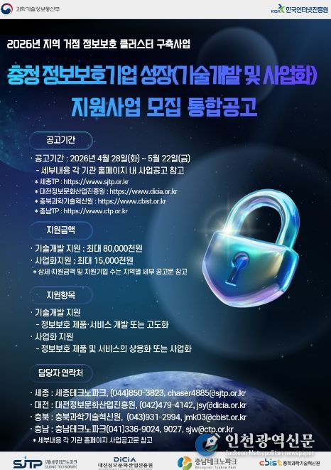 [인천광역신문] 최예준 기자 | 세종테크노파크는 정보보호 유망기업 발굴 및 성장 지원을 위해 ‘정보보호 성장(기술개발 및 사업화) 지원사업’ 충청권 통합공고를 4월 28일부터 진행한다고 밝혔다.