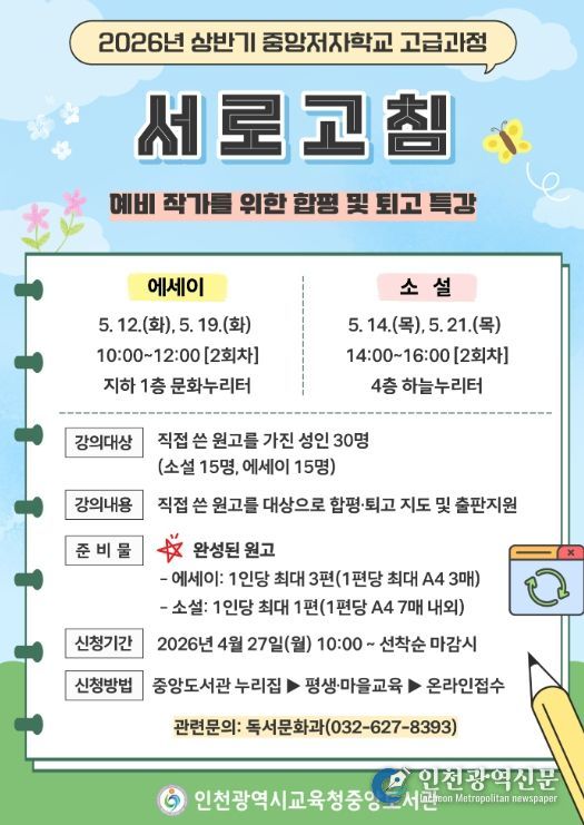 [인천광역신문] 최예준 기자 | 인천광역시교육청중앙도서관은 4월 27일부터 예비 작가를 위한 ‘중앙저자학교 고급과정’ 참여자를 모집한다.