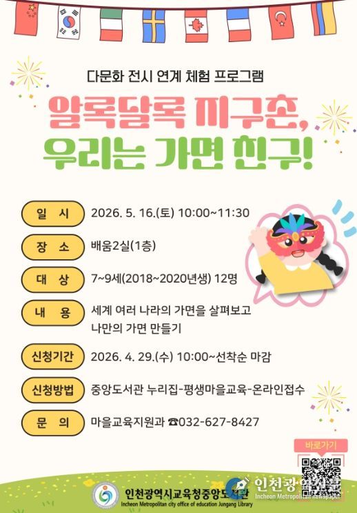 [인천광역신문] 최예준 기자 | 인천광역시교육청중앙도서관은 5월 16일 다문화 전시 연계 체험 ‘알록달록 지구촌, 우리는 가면 친구!’를 운영한다.