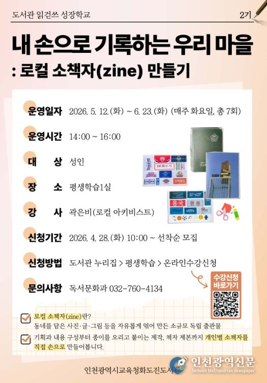 [인천광역신문] 최예준 기자 | 인천광역시교육청화도진도서관은 오는 28일부터 지역의 일상을 기록으로 담아내고 공유하는 시민 참여형 프로그램 ‘내 손으로 기록하는 우리 마을’의 참여자를 모집한다.