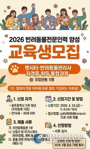 [인천광역신문] 최예준 기자 | 광주광역시는 반려동물 산업 성장에 대응하고 전문역량을 갖춘 인재 양성을 위한 ‘2026년 반려동물 전문인력 양성교육’을 실시한다.