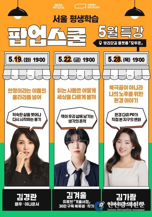 [인천광역신문] 최예준 기자 | 서울특별시평생교육진흥원이 지난 4월 도봉구 쌍문역 인근에 개관한 서울시 첫 역세권 평생학습 거점 ‘서울 평생학습 팝업스쿨’을 확대 운영한다. 시범운영 한 달간 500여 명이 참여했으며, 5월에는 정규강좌, 명사특강, 러닝숍 등 3개 영역에서 총 13개 과정을 편성하고, 650명의 시민 참여를 목표로 한다.