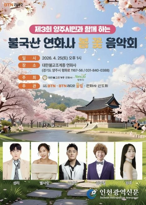 [인천광역신문] 최예준 기자 | 양주시는 오는 4월 25일 오후 1시, 관내 불곡산 연화사(주지 호성스님)에서 ‘제3회 양주시민과 함께하는 불곡산 연화사 봄꽃 음악회’를 개최한다.