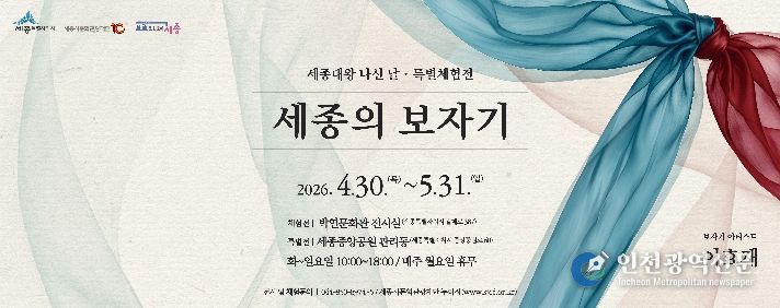 [인천광역신문] 최예준 기자 | (재)세종시문화관광재단은 제629돌 세종대왕 나신 날(5월 15일)을 기념하여 4월 30일부터 5월 31일까지 박연문화관 전시실과 세종중앙공원 관리동에서 특별체험전 ‘세종의 보자기’를 선보인다.