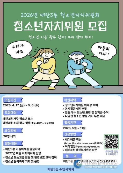 [인천광역신문] 최예준 기자 | 수원시 영통구 매탄3동은 매탄3동 주민자치회가 지역 청소년의 참여를 확대하고, 향후 지역사회를 이끌어 나갈 역량을 기르기 위해 2026년 청소년자치위원회 위원을 모집한다고 밝혔다.