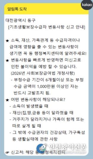 [인천광역신문] 최예준 기자 | 대전 동구는 국민기초생활보장 생계급여 수급자를 대상으로 ‘변동사항 신고 알림톡’ 서비스를 본격 운영한다고 24일 밝혔다.