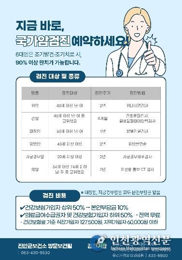 국가암검진사업은 암 치료율을 높이고 사망률을 낮추기 위해 시행되고 있으며, 위암·대장암·간암·유방암·자궁경부암·폐암 등 6대 암을 대상으로 한다. 의료급여 수급권자와 건강보험료 하위 50% 대상자는 무료로 검진을 받을 수 있으며, 그 외 대상자는 검진비의 10%만 부담하면 된다.
