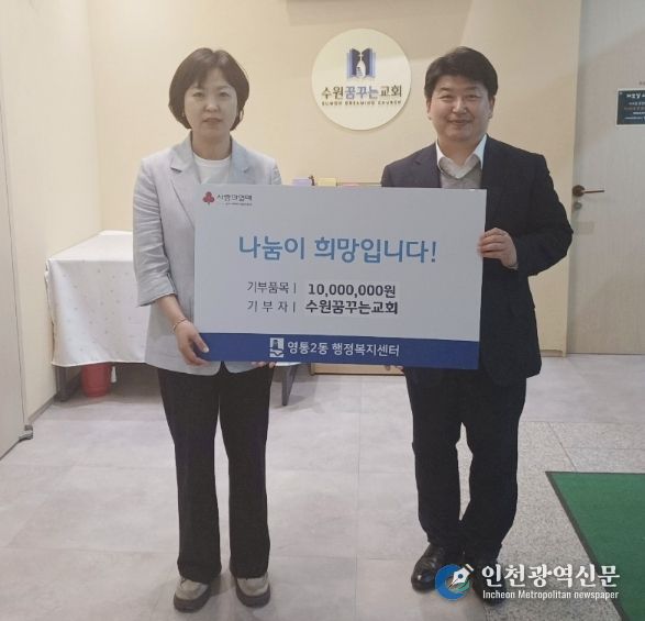 [인천광역신문] 최예준 기자 | 수원시 영통구 영통2동은 지난 23일 수원꿈꾸는교회가 지역사회 내 취약계층 지원을 위해 교인들과 함께 모금한 사랑의 성금 1천만원을 영통2동 행정복지센터에 기부했다고 밝혔다.