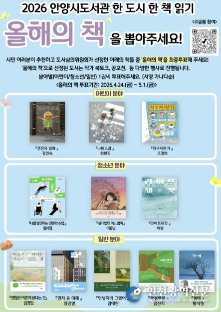 [인천광역신문] 최예준 기자 | 안양시는 2026년 한 도시 한 책 읽기 ‘올해의 책’ 선정을 위한 시민 선호도 조사를 오는 5월 1일까지 온·오프라인으로 진행한다고 24일 밝혔다.
