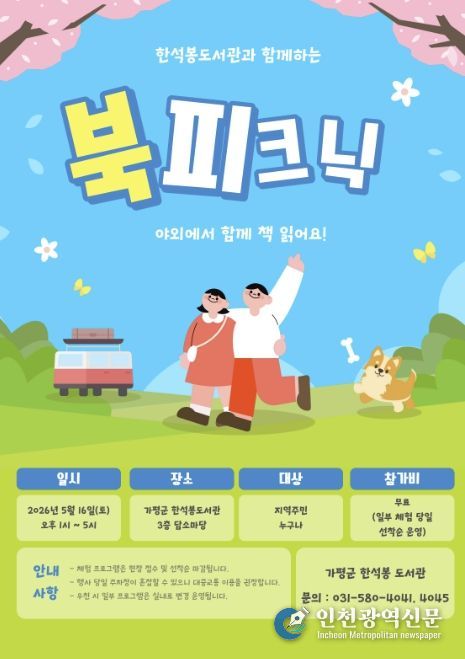 [인천광역신문] 최예준 기자 | 가평군은 5월 가정의 달을 맞아 오는 16일 한석봉도서관 3층 담소마당에서 ‘가족과 함께하는 북 피크닉’ 행사를 개최한다고 밝혔다.