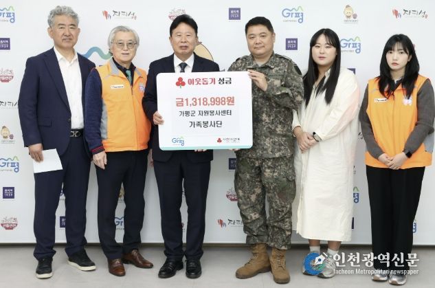 [인천광역신문] 최예준 기자 | 가평군 자원봉사센터 가족봉사단은 23일 가평군청 군수실에서 이웃돕기 성금 기탁 전달식을 가졌다. 이날 행사에는 서태원 가평군수를 비롯해 연기복 가족봉사단 회장, 이명열 가평군 자원봉사센터장 등이 참석했다.