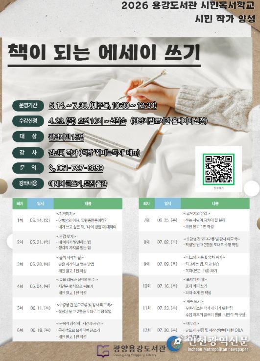 [인천광역신문] 최예준 기자 | 광양용강도서관은 ‘문학책의 해’를 맞아 시민의 글쓰기 역량을 높이기 위해 ‘책이 되는 에세이 쓰기’ 프로그램 수강생을 모집한다고 밝혔다.