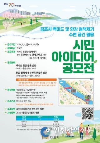 [인천광역신문] 최예준 기자 | 김포시가 한강 철책 제거 부지와 백마도 등 천혜의 수변 자원을 시민들의 쉼터와 문화 공간으로 탈바꿈하기 위해 ‘시민 아이디어 공모전’을 개최한다고 밝혔다. 이번 공모전은 ‘김포시 백마도 및 한강 철책 제거 수변 공간 활용’을 주제로, 시민들의 창의적이고 실효성 있는 아이디어를 발굴해 시정 운영에 적극 반영하기 위해 마련됐다.