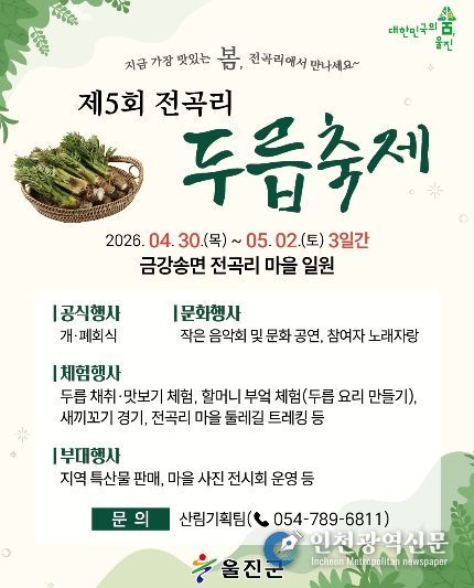 [인천광역신문] 최예준 기자 | 울진군 금강송면 전곡리에서 봄철 대표 산나물인 두릅을 주제로 한 ‘제5회 전곡리 두릅축제’가 오는 4월 30일부터 5월 2일까지 3일간 전곡리 마을 일원에서 개최한다.
